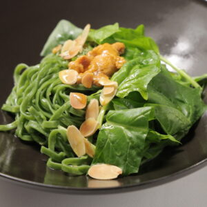 生ウニをのせた濃厚クリーム ソース、ホウレン草を練りこんだ タリオリーニ